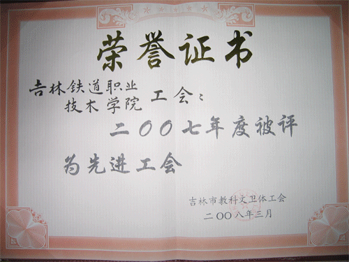 在这次会议上,我学院工会和王丽秋同志分别受到表彰。学院工会被评为2007年度先进工会,王丽秋同志被评为模范工会主席。