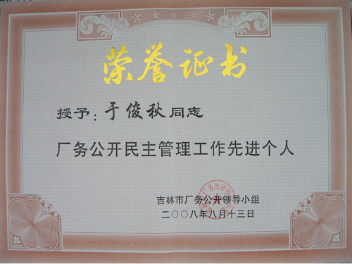 为了深入贯彻落实党的十七大精神,推动企事业单位厂务公开民主管理工作的不断深入,促进和谐劳动关系的构建,完善和发展基层民主政治,吉林市厂务公开领导小组决定,对近年来在厂务公开民主管理工作中做出突出贡献的一批先进单位和先进个人予以表彰。我学院党委书记于俊秋同志被评为吉林市厂务公开民主管理工作先进个人。