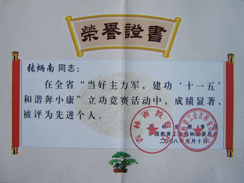 在这次活动中,我学院院长张炳南同志被授予“当好主力军,建功‘十一五’,和谐奔小康”立功竞赛活动先进个人荣誉称号。
