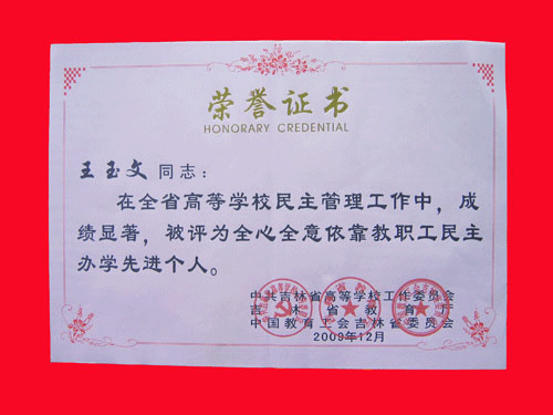 由于王玉文和李彦同志在全省高等学校民主管理工作中,成绩显著,2009年12月,被中共吉林省高等学校工作委员会、吉林省教育厅、中国教育工会吉林省委员会授予全心全意依靠教职工民主办学先进个人。
